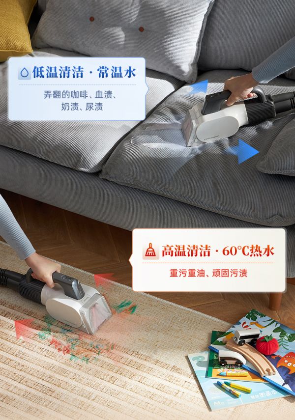 不同脏污特性不同,清洗方法也会有所不同,方法没用对,污渍就很难真的洗干净。然而传统的布艺清洗机只有一个档位,水温无法选择,能清洗的污渍范围实在有限。