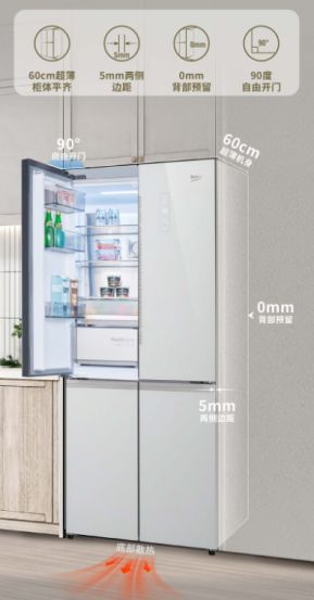 Beko倍科506L随心嵌系列冰箱的0嵌设计,两侧只用提前留好5mm安装空隙,背部0mm完全贴合,不需要特意预留散热空间也不需要预留背部空间。它采用底部散热方式,既可以避免卫生死角,同时也能让冰箱嵌入橱柜中更贴合。并且并不会因为柜体阻挡而影响冰箱开合,506L随心嵌系列冰箱可以进行90°开合,不受柜体限制,拿取自由无障碍。