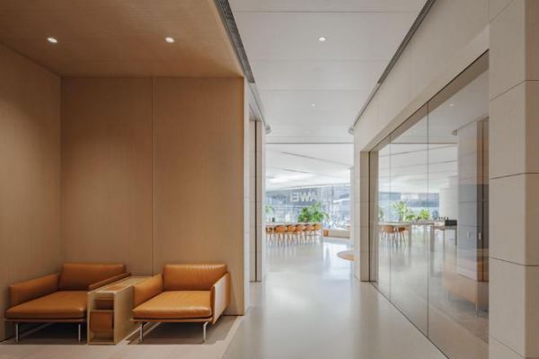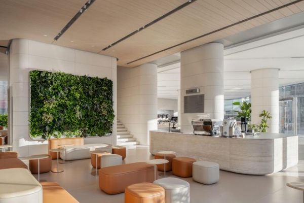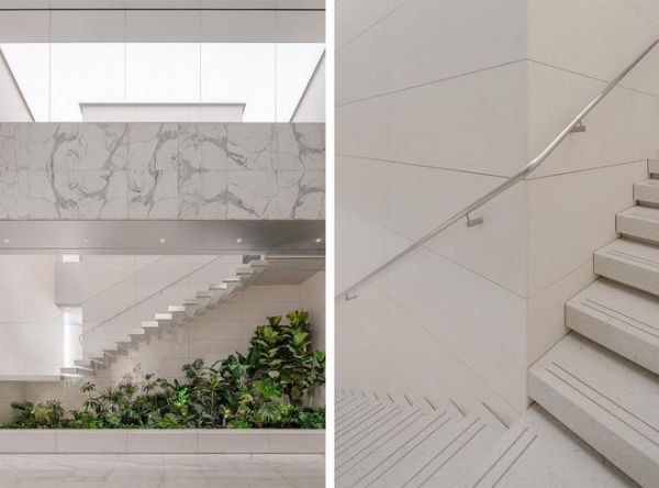 绿洲咖啡区,旨在为访客提供一个互动体验场所,鼓励人们使用产品并融入“城市客厅”。咖啡区本质上是一个多功能空间,可用于举办活动、讲座或日常聚会。它在设计上采用木质天花、暖色微水泥地板和茂密的绿植墙,并放置了一座洞石咖啡吧台,呈现了一个自然、明亮温馨的韵律空间。咖啡区的楼梯设计独具匠心,踏步的另一端连接着一整块玻璃面板扶手,悬浮于郁郁葱葱的室内花园上方。这些细节,均是受到长城蜿蜒于北京苍翠山脉的景色启发。