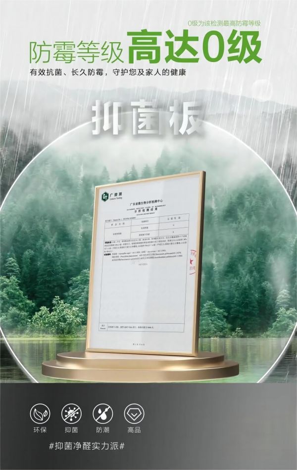 无惧霉菌的考验,防霉抑菌,层层守护为家保驾护航,有效抑制板材上的菌类生长,防霉等级高达0级。对于潮湿地区家居板材容易发霉的卫生死角,抑菌板面对霉菌考验出色发挥,加倍守护。