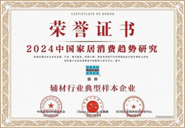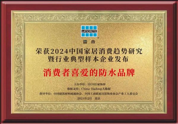 2月29日,由HOME家饰界发起并主办,中国建筑材料流通协会、全国工商联家具装饰业商会产业工人委员会联合指导,China Hadoop大数据作为数据支持的2024中国家居消费趋势研究暨行业典型样本企业成果在京发布,雷帝凭借其卓越表现、持续的品牌热度、深厚的行业影响力及优异的消费者口碑成功入选“2024辅材行业典型样本企业”,并再次荣获“消费者喜爱的瓷砖胶品牌”、“消费者喜爱的防水品牌”、“消费者喜爱的填缝剂品牌”等多个奖项。