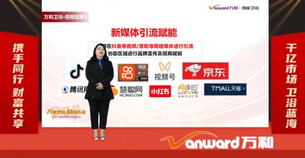 最后,万和智能卫浴招商经理梁淑铷详细讲解了本次直播招商政策,为合作伙伴提供全方位的支持。着重提到万和品牌给各位合作伙伴的赋能,不仅限于线下10000家热厨资源共享,还将通过视频号、抖音等新媒体运营方面为伙伴们引流赋能。