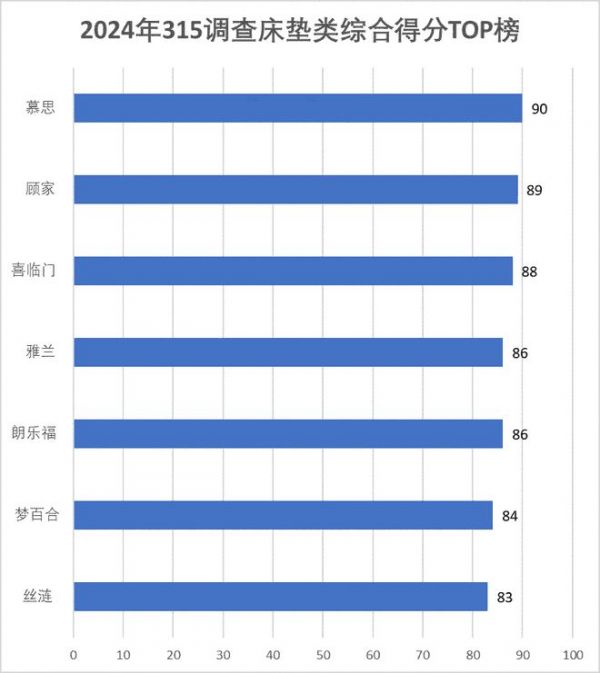 整体来看,本次315家居服务调查的床垫品牌综合平均分为78.45分,共有7个品牌达到80分以上,入围2024年网易家居315服务调查TOP榜。在本次315家居服务调查中,慕思以90分的成绩摘得桂冠,顾家以89分位居第二。