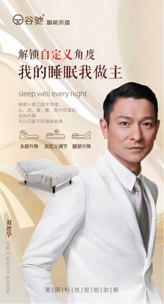 此前,谷驰智能床垫联合刘德华主演电影进行的联合宣发备受瞩目,华哥的形象露出与谷驰智能床垫的设计调性相得益彰。主张“我的睡眠我做主”的个性化的品牌调性,旨在为客户打造属于自己的睡眠世界,让客户独享高品质睡眠。