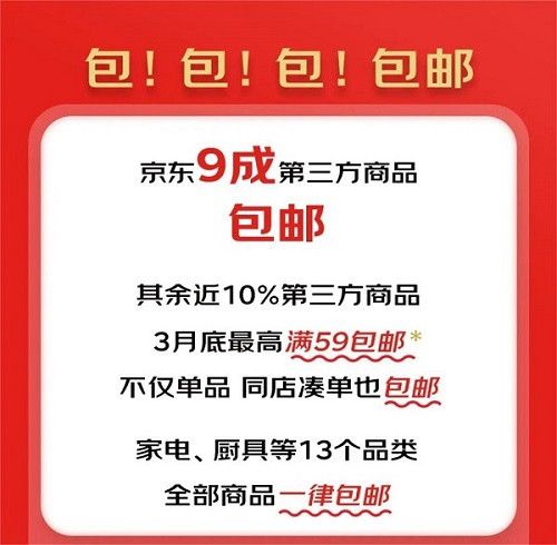 近日,京东官方发布公告,在9成第三方商品包邮的基础上,剩余1成也将在3月底享受最高满59元包邮的政策。与此同时,包括家电、厨具等13个品类全部商品均为0元包邮,即不限金额一律包邮!