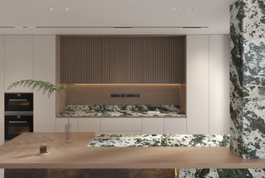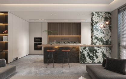 水吧区以淡雅为主色调,绿意点缀,奢石墙面勾勒铺陈,更具仪式感,规整的比例线条让区域拥有美妙的律动节奏。精致柔和的木纹与石纹台面,石纹细腻富有质感,营造出低调奢华的质感,彰显功能与美观兼顾的结构美学。