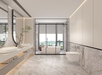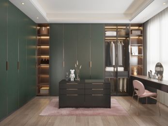 通过精巧的造型规划、灯光布局与收纳、展示功能等进行整合,流畅的空间布局和奢石应用完美融合,规整的比例线条,也让衣帽间拥有美妙的律动节奏。卫浴空间布局合理又贴心,整体干净纯粹,推拉门隔离干湿区,洗手台和淋浴区采光都满足,实用又美观,采用奢石材质,重组成一个充斥着个人情绪的静谧空间。