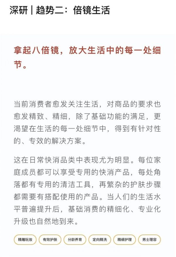 趋势报告中可以发现消费者的生活日趋精细化,精雕玩妆、有效护肤、分龄养育、定向精洗、精细护理、男士理容,每个应用场景里都是消费者们对于生活细节的关注。当前消费者愈发关注生活,对商品的要求也愈发精致、精细,除了基础功能的满足,更渴望在生活的每一处细节中,得到有针对性的、专效的解决方案。