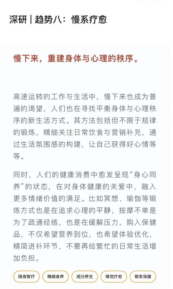 同时,消费者健康消费中愈发呈现“身心同养”的状态,在对身体健康的关爱中,融入更多情绪价值的满足。比如冥想、瑜伽等锻炼方式也是在追求心理的平静,按摩不单是为了疏通经络,也是在缓解压力,购入保健品,不仅希望营养到位,也希望体验优化,精简进补环节,不要再给繁忙的日常生活增加负担。