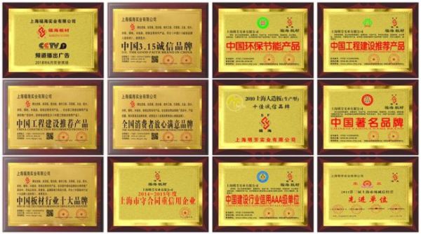 福海板材品牌先后荣获“上海市名牌产品100强”、“上海名牌产品”、“十佳诚信品牌”、“中国著名品牌”、“中国建设行业信用AAA级单位”、“中国3.15诚信企业”、“上海市守合同重信用企业”等荣誉称号。