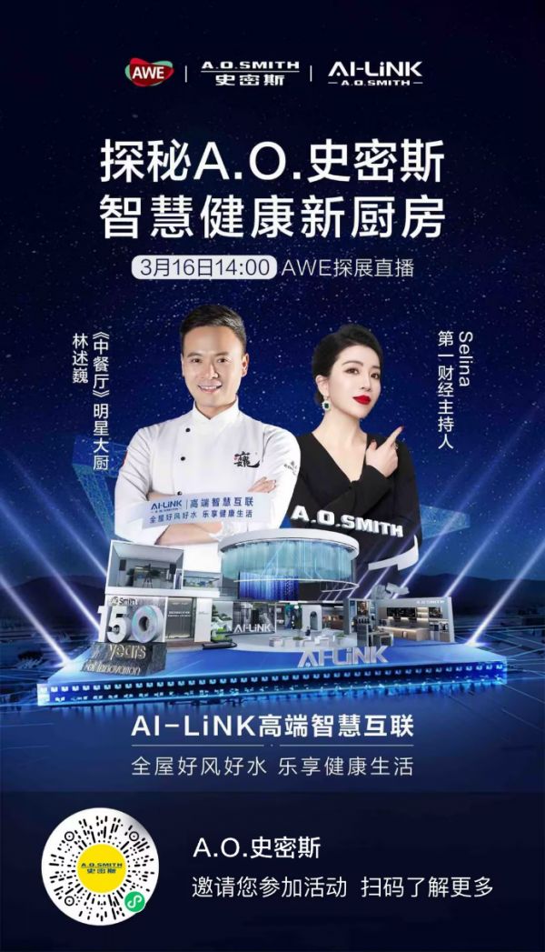 AWE期间,A.O.史密斯还准备了惊喜多多的直播福利活动,回馈广大用户,让您享受超值惠购新体验,期待您即刻扫码预约观看,届时第一时间进入直播间,抢缤纷好礼、享超值好物吧!