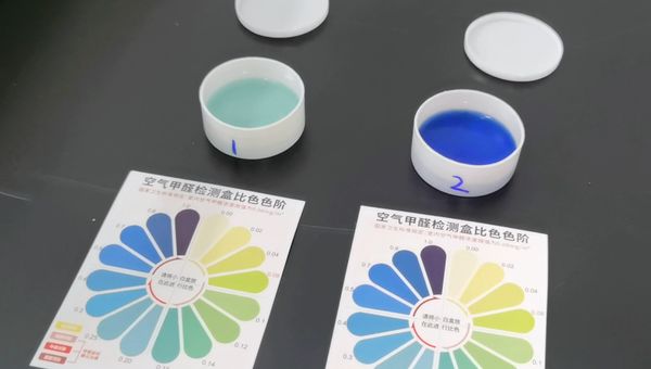 1号盒的颜色数值在0.04-0.08mg/m³之间,而2号盒的颜色比较深,数值在0.8mg/m³以上,从而得出结论,1号热康板的甲醛释放量仅为2号市面上其他板材的十分之一。