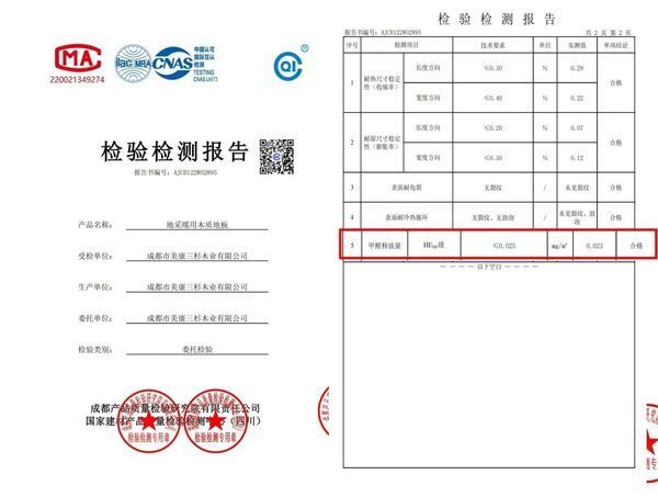 HENF级热康板通过权威机构检测,其环保等级达到了HENF级(采暖无醛级)标准,甲醛释放量低至0.022mg/m³,国标ENF级是在23度下检测,而HENF级是在30度下检测,根据温度升高1℃甲醛释放增加0.4倍计算,HENF级较国标ENF级严苛了近3倍。
