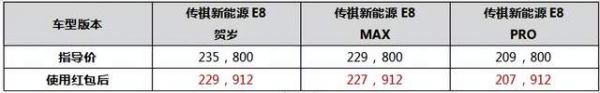 其中,下订传祺新能源E8贺岁版可专享5888元购车券,常规版本专享1888元购车券(各版本抵扣红包后价格详见下表)。用户获得优惠券后,在活动期间通过传祺新能源小程序上订购E8,在支付购车尾款时,系统将根据对应车型抵扣对应优惠券金额,不到23万就能把龙年限定贺岁版开回家。