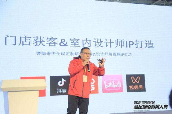 在大典现场《2024年度家居优选新品》发布会上,德莱美运营总监李富强带来了《门店短视频获客&室内设计师IP打造》主题演讲。旨在帮助现场观众了解如何利用短视频平台提升门店的客流量和室内设计师的个人品牌影响力,从而实现业务增长和个人价值提升。同时,通过分享具体的案例和经验,激发家居从业者的创造力和行动力,鼓励他们积极尝试和实践短视频营销和IP打造的策略。