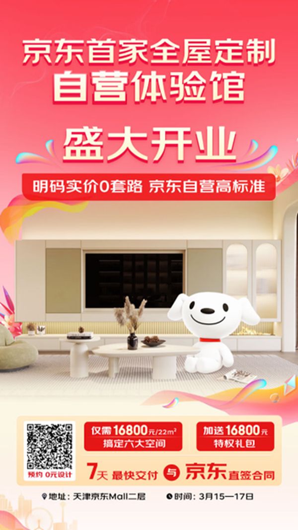 值得一提的是,天津市民3月31日前到访体验店预约,或打开京东APP搜索“自营全屋定制”线上报名,即可享受免费全屋设计、免费上门量房、免费VR效果图等超值优惠。