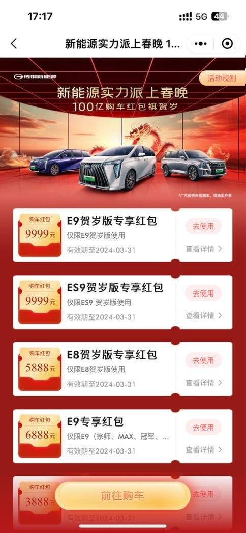 在2月9日到3月31日的活动期间,所有用户均可通过传祺新能源小程序、传祺新能源APP、广汽传祺APP、广汽传祺小程序进入“100亿购车红包”活动的H5活动页面领取总价值46326元红包。其中,E9贺岁版与ES9贺岁版将专享面额高达9999元的购车券;E9常规版本将专享面额6888元的购车券;ES9常规版本将专享3888购车券;E8贺岁版则专享5888元购车券,常规版本专享1888元购车券;而新能源之外的其他车型,也将享受3888元购车券,活动优惠力度涵盖广汽传祺所有主流车型。
