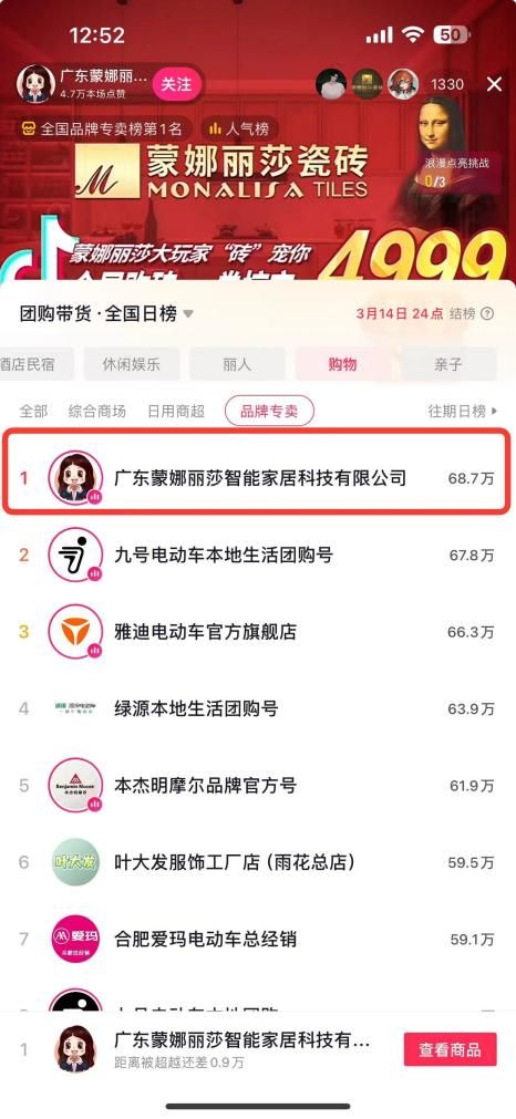 3月13日“数字家居消费节”正式开启品牌专场直播,以全网流量引爆话题热度。其中,「蒙娜丽莎品牌专场」开播仅一小时荣升全国品牌专卖榜第10名,当日新号首播直冲全国品牌专卖榜第七名,新增精准粉丝2500+,热度爆表引爆全场!次日,精准客群直播间大爆发,开播2小时即冲上团购带货全国品牌专卖榜TOP4。截止至3月14日13:00,蒙娜丽莎瓷砖直播间已经冲顶全国团购带货品牌榜TOP1,拥有68.7万人气值!