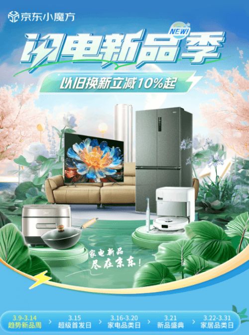 与此同时,京东还携手除上述十大品牌外的格力、石头、华凌、芝华仕、德施曼、固特等国内外知名家电家居品牌启动“闪电新品季”活动。3月9日至22日期间,京东将首发上线数十款家电家居“闪电新品”,并提供以旧换新立减10%起、1元预定加享更多好礼、至高12期免息、限量新品0元购等多重福利,助力消费者轻松完成家电家居焕新,畅享智能、舒适生活体验。现在就打开京东APP搜索“闪电新品”进入会场选购!