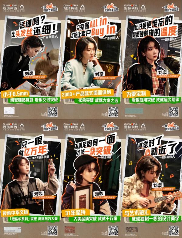 在北大考古系学霸、广告公司创意总监、音乐唱作人等个人职业身份中的自由转换以及对音乐的执着热爱,展现出刘恋不断突破自我的个人特质,与冠珠瓷砖追求品质极致创新的产品特质不谋而合。因此双方在合作中展现出极高的契合度。在315品质主题片中,刘恋一人分饰北大考古系学霸、音乐唱作人、TVC导演、广告创意人四角,通过全方位释放“斜杠青年”的多元特质,巧妙展现出冠珠瓷砖在成就大美品质的过程中,品质、艺术、创新、应用、体验等方面的多维度突破。