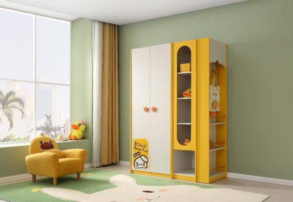 儿童床、衣柜、收纳柜等儿童家居新品均以明亮橙黄色搭配纯净白色,带来活泼温暖的视觉观感,萌趣可爱的小黄鸭造型,让童趣时光更加出彩。