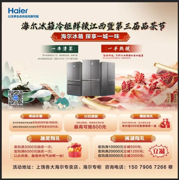 3月23日,海尔冰箱冷柜携手鲜辣江西暨第三届品茶节,开启上饶站 “海尔冰箱,探享一城一味”活动,活动将于上饶各大海尔专卖店和海尔专柜举办,海尔冰箱冷柜邀您前往。鉴赏美食,细品好茶,一同见证海尔冰箱冷柜保鲜硬“实力”。