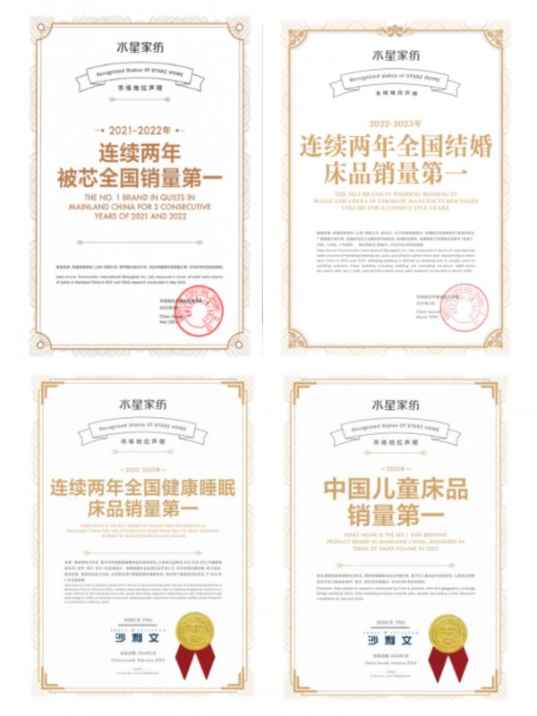 据了解,2023年水星家纺以品牌价值157.13亿元荣登“中国500最具价值品牌”。同时,在多项细分领域亦取得了斐然成绩, 据权威机构调研数据显示:水星家纺“2021-2022年 连续两年被芯全国销量第一”、“2022-2023年 连续两年全国结婚床品销量第一”、“2022-2023年 连续两年全国健康睡眠床品销量第一”、“2023年中国儿童床品销量第一”。