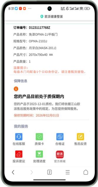 同时,以经典黑金拼色设计的新防伪品牌标安装于门扇合页侧,用户只需打开手机NFC功能并将手机靠近防伪品牌标,等待1-3秒后即可识别成功,快速进入服务界面。一对一云端产品数字档案信息齐全,正品溯源安心用;质保信息、在线客服等服务模块一应俱全,智能服务轻松享。