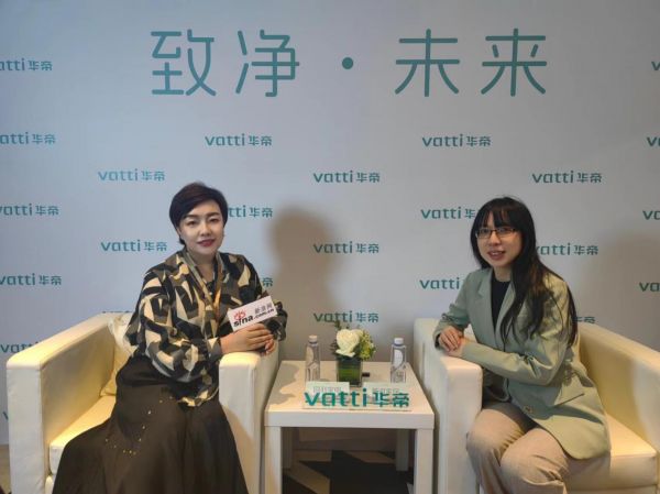 记者采访株百股份家电事业部总经理曾芬(左)
