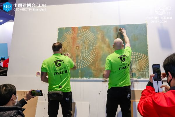 威罗展厅内的观众络绎不绝,除了缤纷美丽的色彩,还有来自意大利合作企业Adicolor集团代表、Cromology集团代表飞抵上海助力,在现场用艺术涂料进行涂装创作,气氛热烈。
