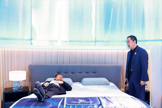 3月18日深圳家具展/智博会现场,两位客人正在体验舒达iComfort智能床