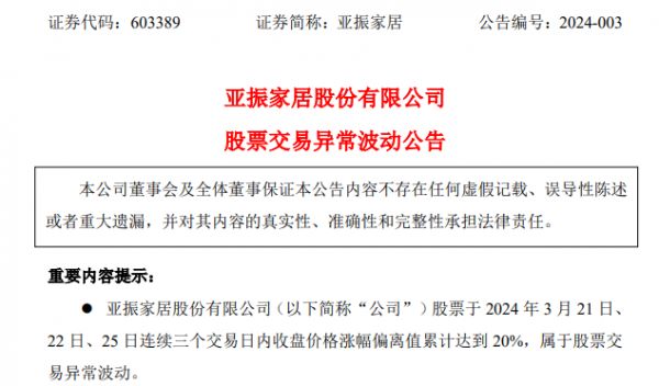 因股票异常波动,亚振家居(603389.SH)收到问询函,公司股票于2024年3月21日、22日、25日连续三个交易日内收盘价格涨幅偏离值累计达到 20%,属于股票交易异常波动。