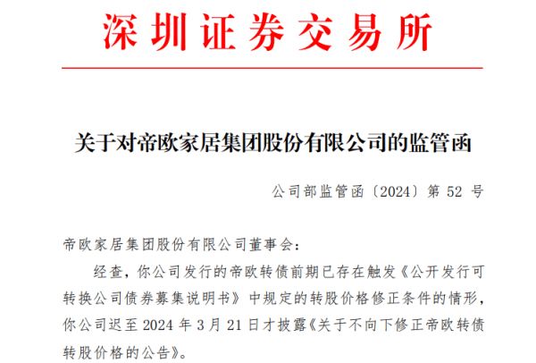 3月22日,帝欧家居(002798.SZ)公告称,因未及时披露提示性公告,导致其收到深圳证券交易所的监管函。具体而言,帝欧家居未在预计触发转股价格修正条件的5个交易日前及时披露提示性公告,违反了本所《股票上市规则(2023年8月修订)》第 1.4 条、第 2.1.1 条及《上市公司自律监管指引第15号——可转换公司债券》第十五条的规定。