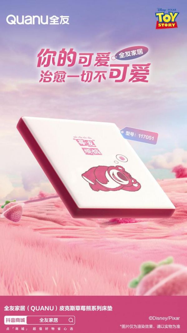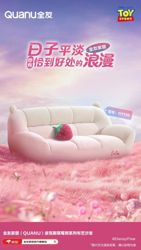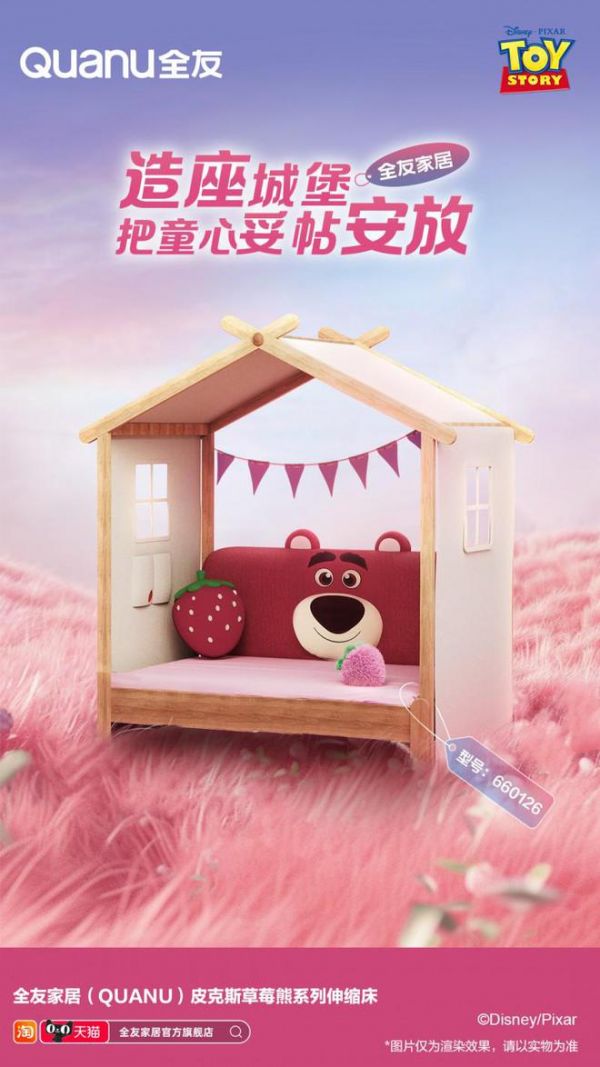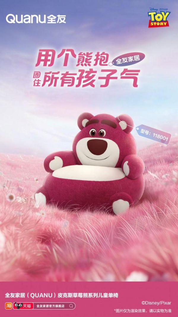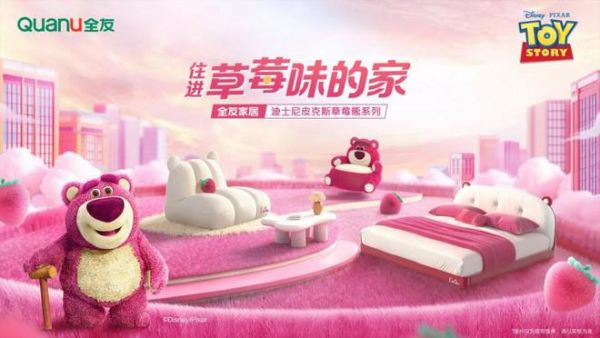 自2022年,全友与知名卡通形象IP“B.Duck小黄鸭”跨界联名,推出的系列产品一经上市就广受好评。为顺应消费者的个性化需求,全友于2024年推出草莓熊系列家居新品,邀请大家一起住进草莓味的家!