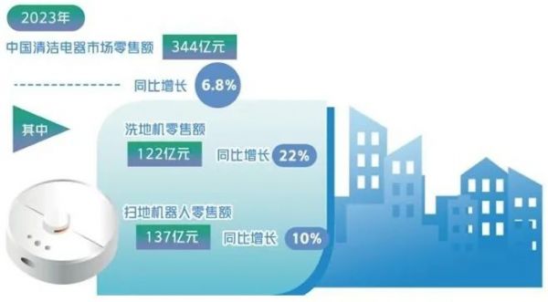 奥维云网数据显示,2023年,中国清洁电器市场零售额为344亿元,同比增长6.8%。其中,洗地机和扫地机器人市场表现尤为突出,洗地机零售额为122亿元,同比增长22%;扫地机器人零售额为137亿元,同比增长10%。