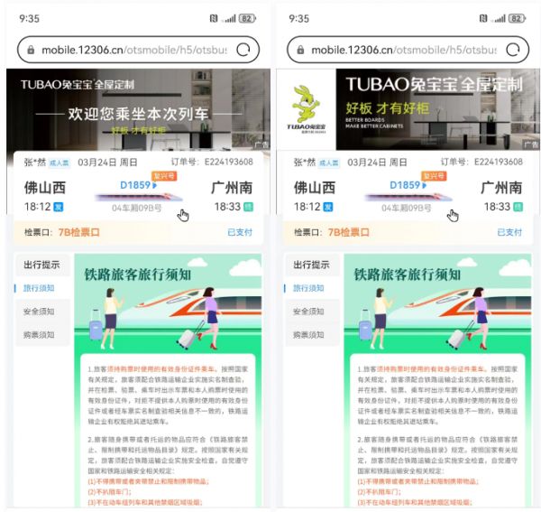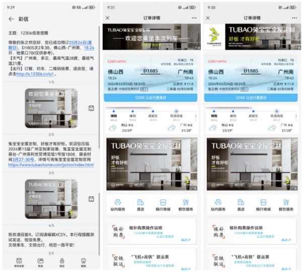 展会前期,兔宝宝全屋定制联合12306线上购票平台,投放线上广告,采用多媒体彩信、短信、微信形式,在购票成功、改签、候补等场景下发送、精准投放、长留存,多次触达出行用户。以更强大的声量,为即将到来的广州展会,提前宣传“热身”,造势赋能。