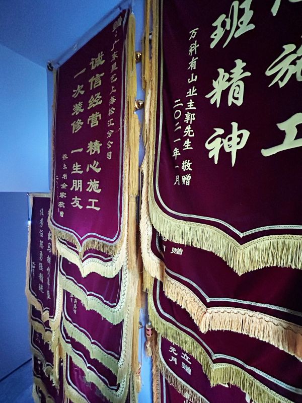 这其中,最令周文娟印象深刻的一面锦旗足足有一人之高:“它来自河南的一位客户。当时,设计师因为忙碌忘记给客户复印设计图纸和报价单产生了误会,施工完毕结算时,被客户投诉至市场监管所,那是松江公司第一次被投诉至行政单位,我们都很紧张,第一时间联系客户询问诉求。虽然客户对我们已经产生了一些信任危机,沟通过程不是很顺畅,但我们本着真诚服务的原则,针对客户的所有诉求,结合文字和拍照的方式,提交了近40页的解决方案,客户被我们的态度所打动,事情圆满解决,并给我们留下这面令人印象深刻的锦旗。我们能扎根松江,靠的是真诚服务!”