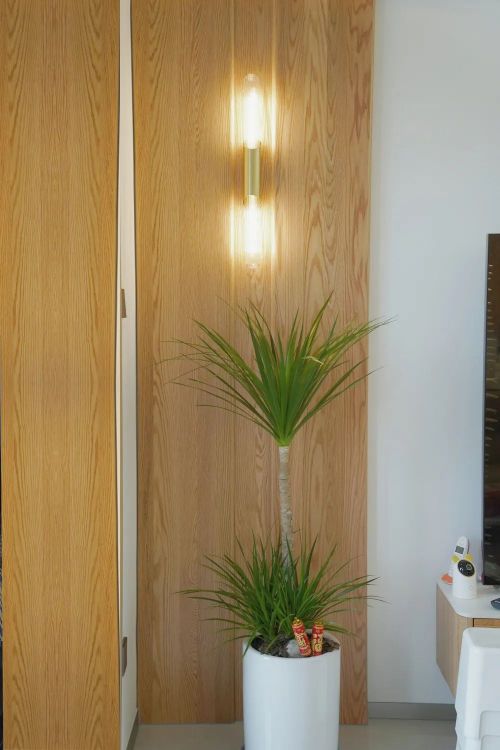 整墙用的都是北美进口红橡木,看起来十分大气。侧边装一排封闭式储物柜,视觉上还能拉伸空间层次感