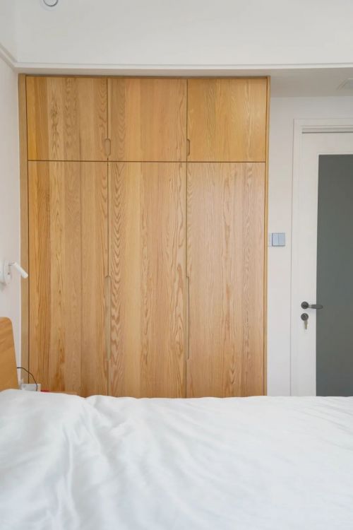 现代风格中白色的定制家具和木材元素搭配起来,让卧室多出自然气息,也更有品位。红橡木本身外观非常精美,自带有明显的木纹,质感细腻。