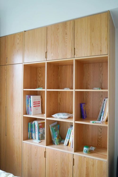 开放式储物格用做书柜,灵活多变,全屋定制让卧室满足学习/休闲/睡眠等多种功能,提升空间利用频率,一次满足多个家居需求。