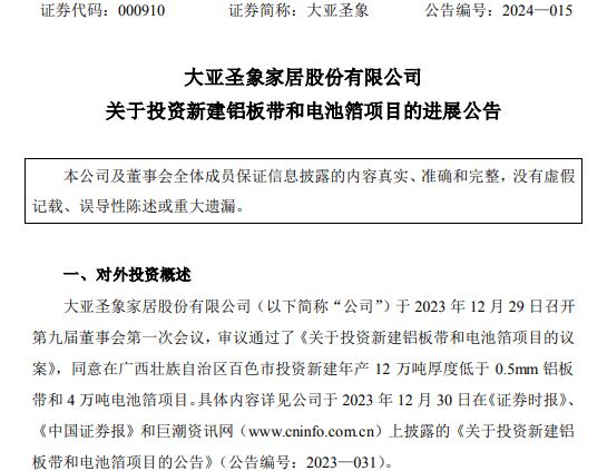 2024年4月7日晚间,大亚圣象(000910.SZ)公告称,2024年4月3日,公司和百色市人民政府签署了《大亚圣象年产12万吨厚度低于0.5mm铝板带和 4 万吨电池箔项目投资协议》。