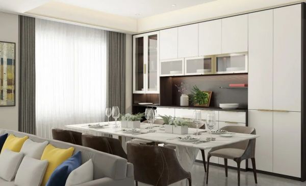 此外,定制柜体创意性的小吧台设计,搭配上金属玻璃柜门与装饰单品,在保障餐厅收纳空间的同时,也具有了明显的层次美感,为居者带来舒适、美好的就餐时光。
