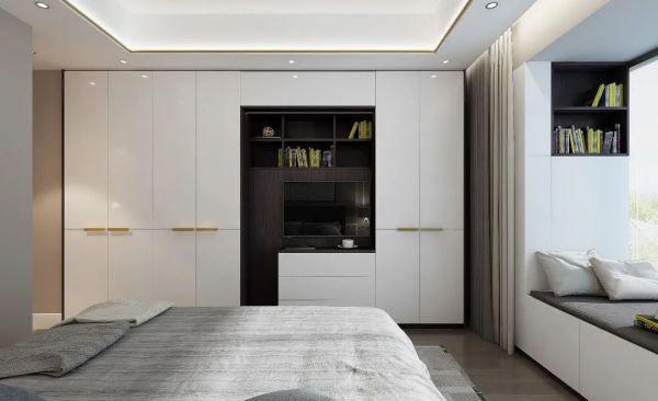 当你的卧室空间足够时,巧妙利用定制柜体,没有飘窗也能自己造,开辟出一块新的休闲区域,看书、聊天、观景,好不惬意。底部与侧边的柜体,还可作为储物空间,进一步提升卧室的收纳能力。