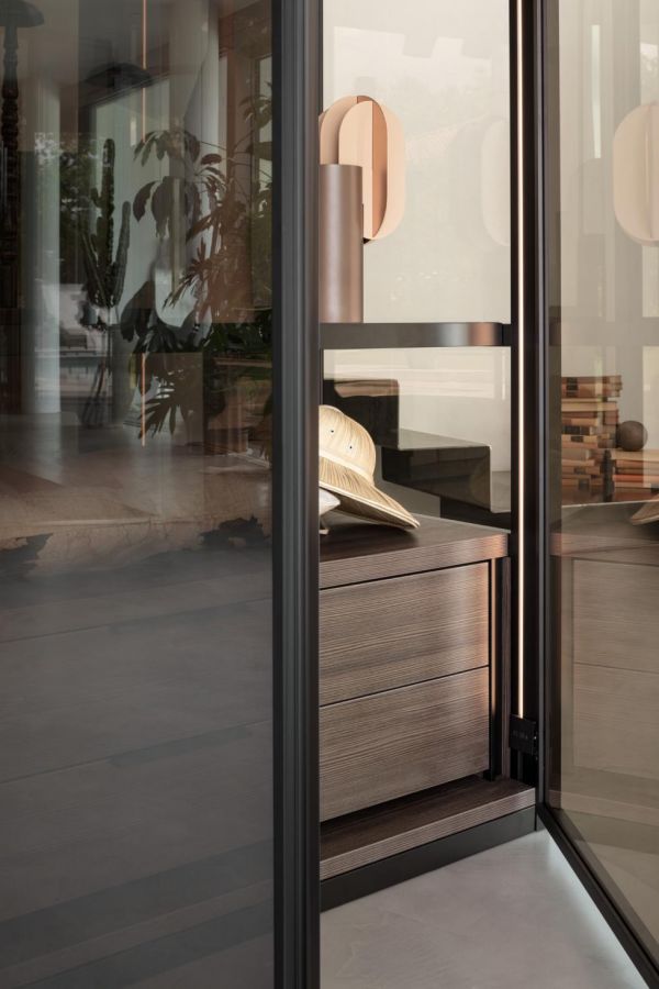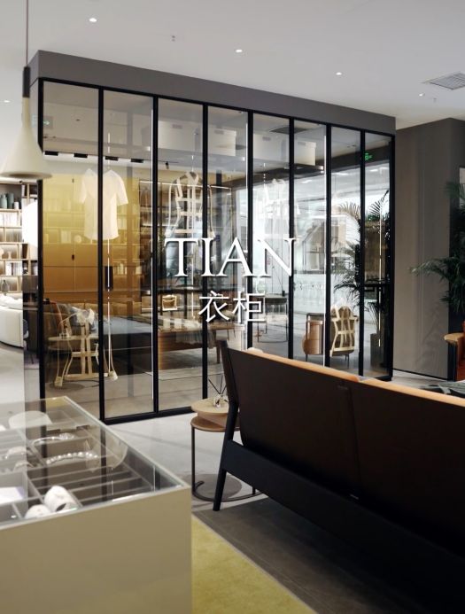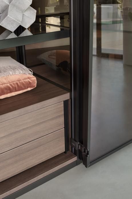 Tian的框架采用简约的线性设计,皆由特种铝框制成。黑色的框架,让简单的线条增加灵动感,撇下繁琐和娇柔做作,出落得纯粹明朗。所有元素都直接固定在框架上,没有可见的螺钉。隐藏式铰链,让门板的开启更隐蔽稳定。框架侧面、内部隔板和柜门均为玻璃材质,不仅透明度和轻盈感更强,也让空间格调进一步提升。