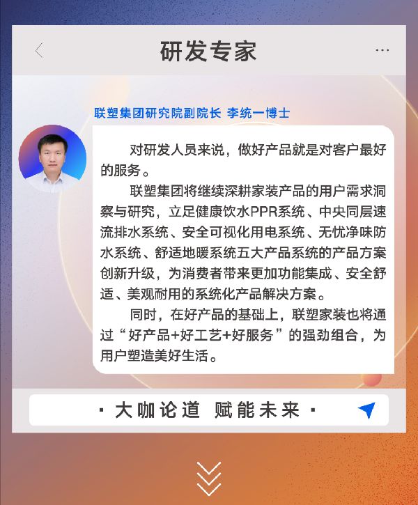 对研发人员来说,做好产品就是对客户最好的服务。联塑集团将继续深耕家装产品的用户需求洞察与研究,立足健康饮水PPR系统、中央同层速流排水系统、安全可视化用电系统、无忧净味防水系统、舒适地暖系统五大产品系统的产品方案创新升级,为消费者带来更加功能集成、安全舒适、美观耐用的系统化产品解决方案。同时,在好产品的基础上,联塑家装也将通过“好产品+好工艺+好服务”的强劲组合,为用户塑造美好生活。