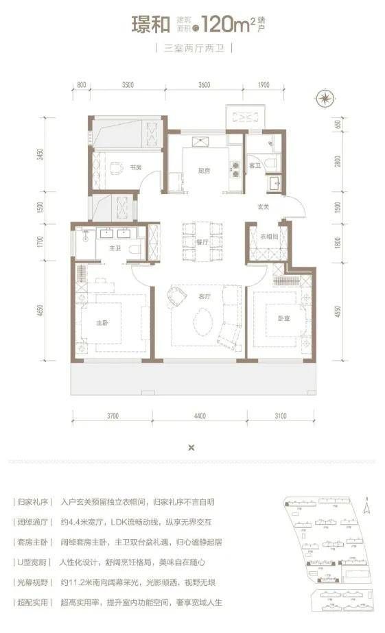 建面约120㎡三居两卫,南向三面宽,方正通透,客厅面宽约4.4米,LDK一体化设计;主卧套房奢侈双台盆,改善氛围拉满。