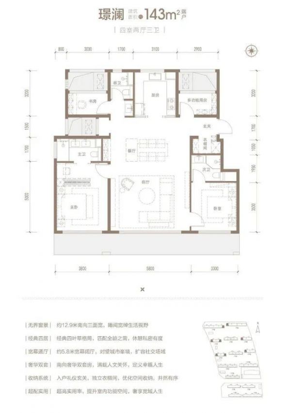 建面约143㎡四居三卫,入户玄关+独立衣帽间,出行起居更加便捷;超大客厅面宽约5.8米,轻松实现在家开party;南向双套房,北向书房+多功能厅,以及抢眼的黑科技,多口之家首选。