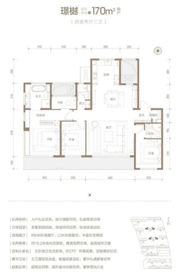 建面约170㎡四居三卫,喜欢大尺度并且想要一步到位的家庭看这里;私密入户玄关+储物间、6米宽超大客厅+餐厨空间、星级主卧配备浴缸...这个户型相当于150平的升级版。