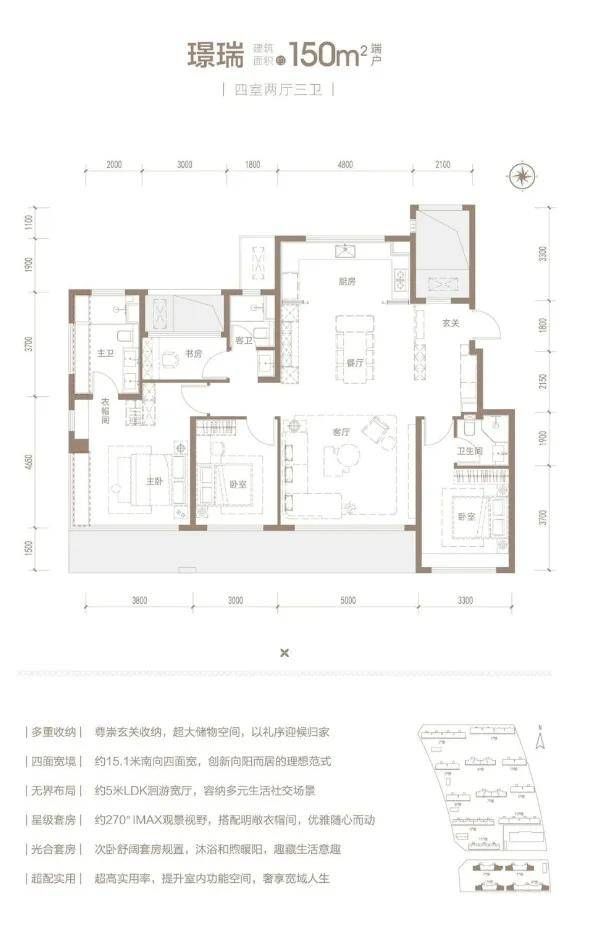 建面约150㎡四居三卫,约15.1米南向四面宽设计+5.5米宽厅+LDK等宽+三卧朝南+双套房+270度观景星级主卧...这个户型属于buff叠满,采光更优秀,空间布局更加出众!