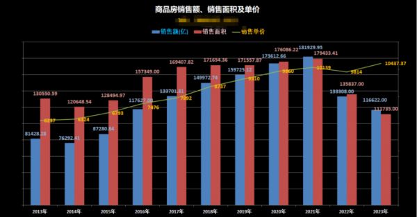 2023年,商品房销售面积111735万平方米,比上年下降8.5%,其中住宅销售面积下降8.2%。商品房销售额116622亿元,下降6.5%,其中住宅销售额下降6.0%。